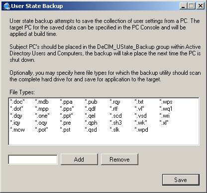 The User State backup tool is used to save settings and data from an existing PC for which a new machine is being